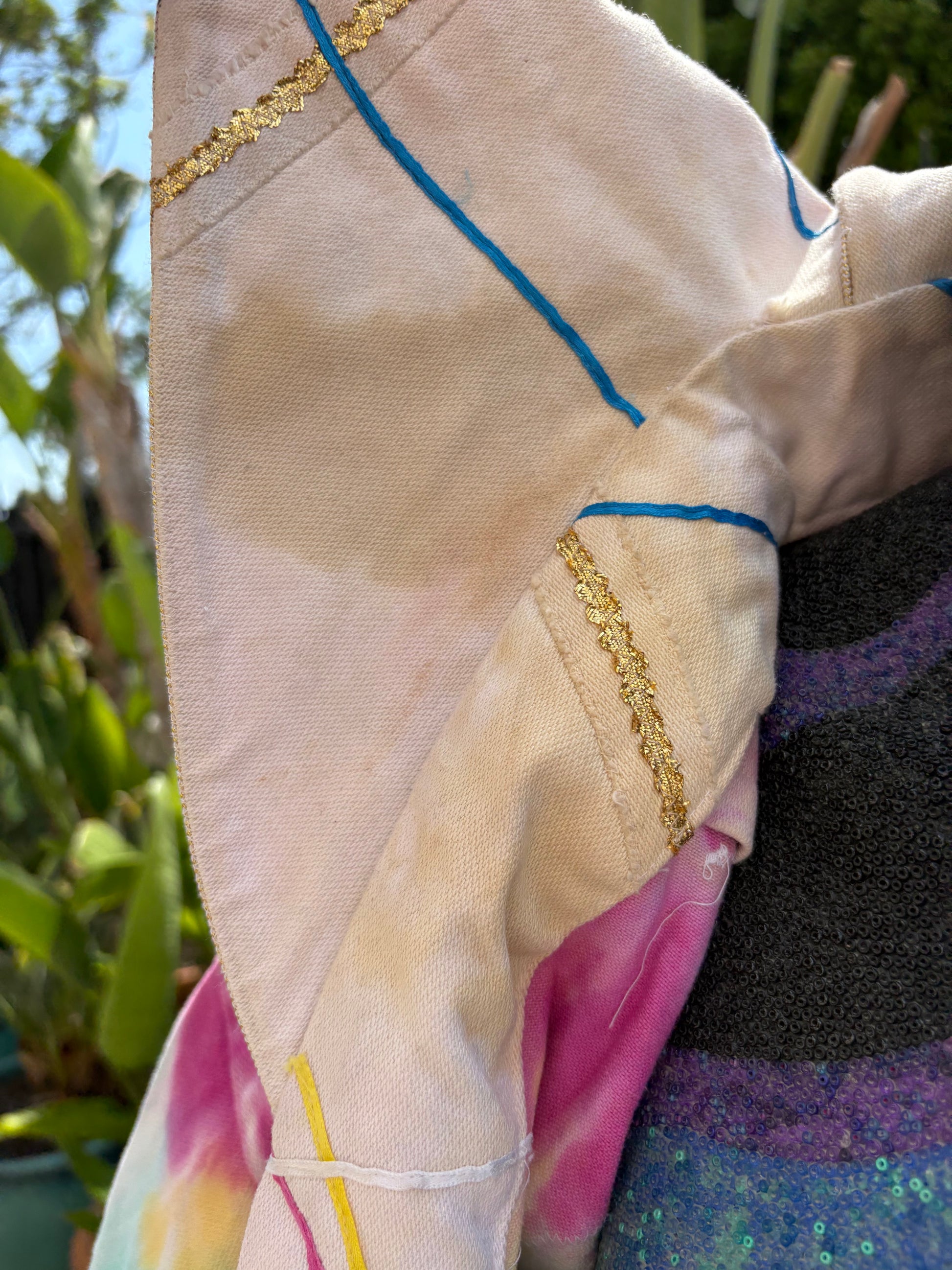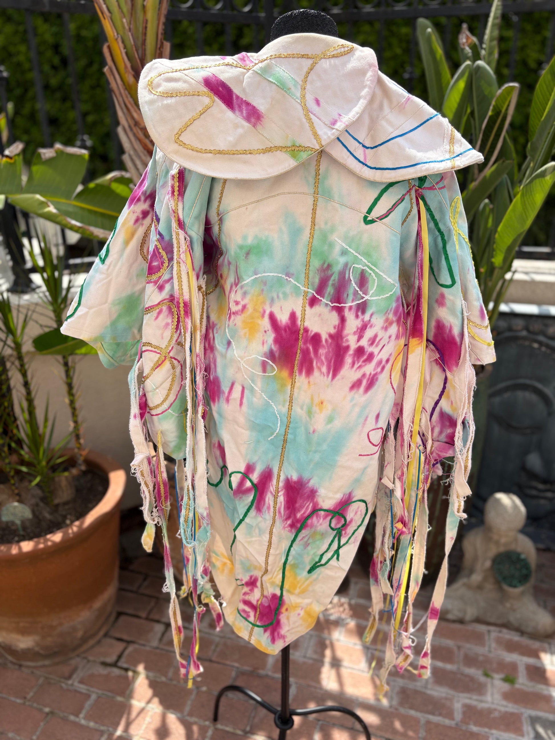 Style: 1 OF A KIND!!!! tie-dyed CUSTOM Canvas custom made stage coat made for George Clinton and gifted to Mallia Franklin. Made of white canvas with ribbons and metallic piping.
